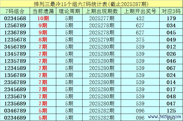 (1)在摆设三已开出的7411期奖号中(统计适度第2025287期),当今7码组六遗漏值最大的组合为:0234568,本期遗漏10期;